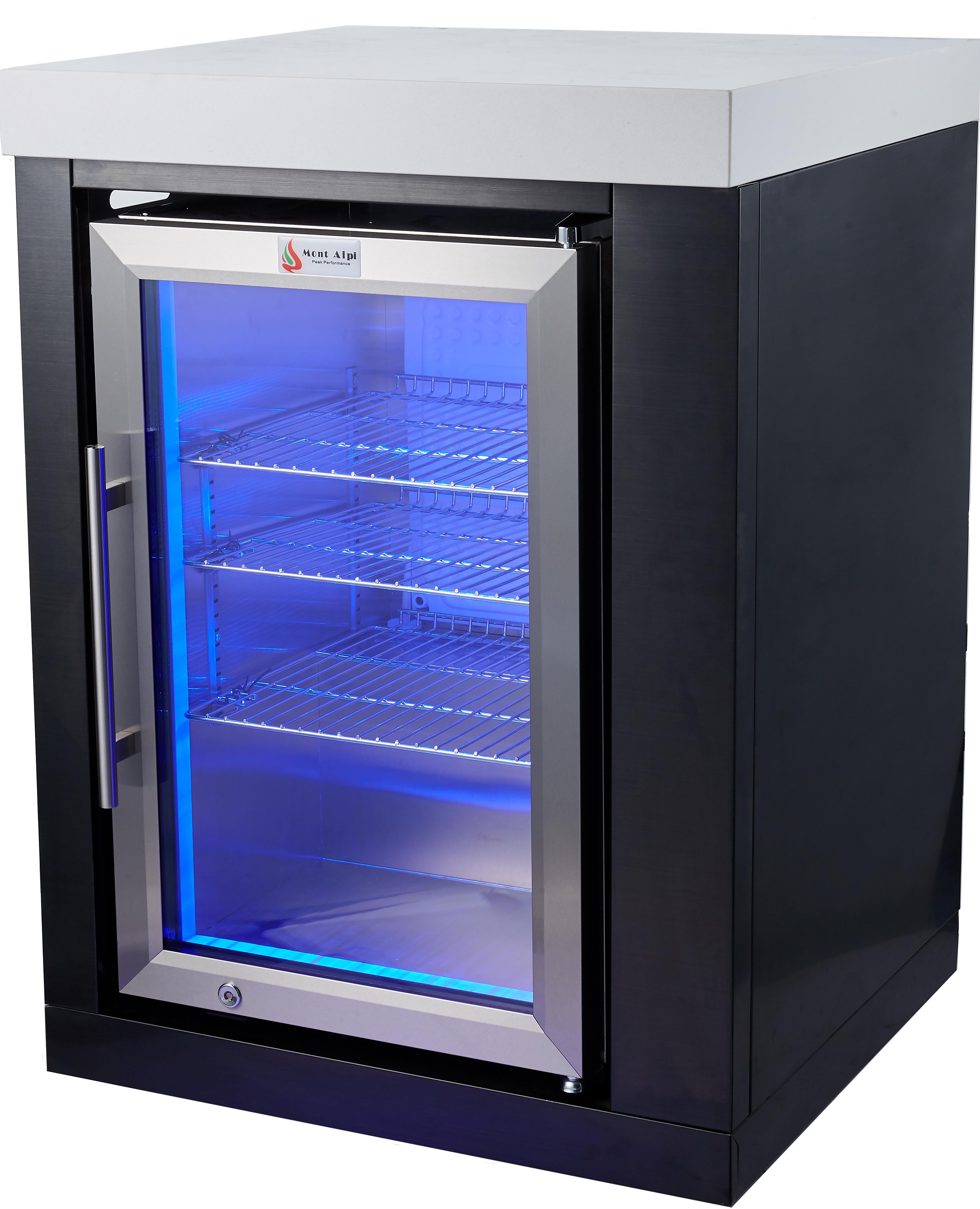 The Mont Alpi Fridge Module in Black Stainless Steel finished with white granite counter surface and waterfall sides makes a beautiful addition to a Mont Alpi Island grill on your patio. It comes standard with an outdoor rated fridge with stylish lights and a locking door. Impress you friends and offer them a beverage.Read More