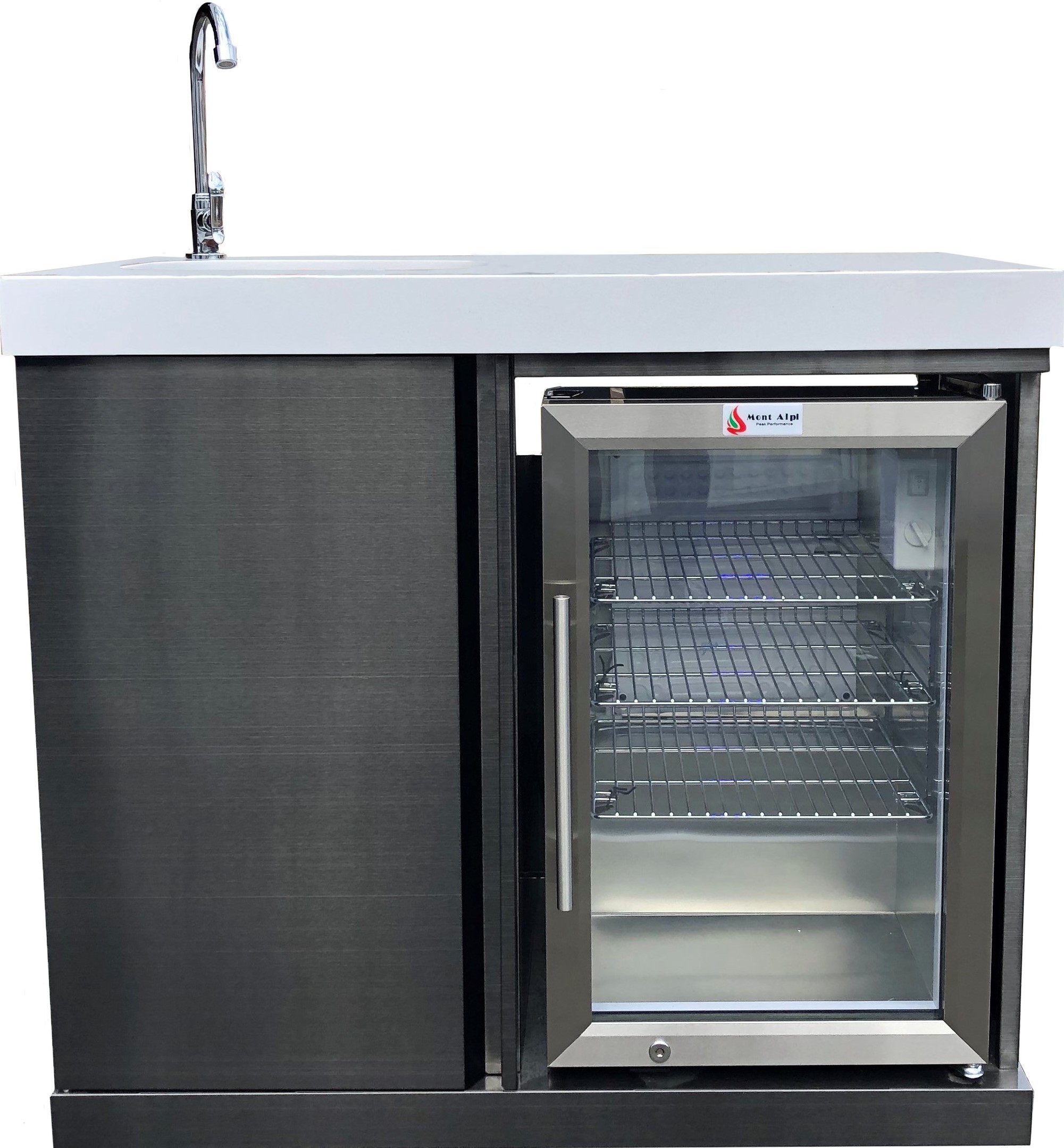 The Mont Alpi all new Black Stainless Steel Beverage Center finished with white granite counter surface makes a beautiful addition to a Mont Alpi Island grill or as a stand alone beverage center on your patio. It comes standard with an outdoor rated fridge with stylish lights and a sink. Impress you friends and offer them a beverage.Read More